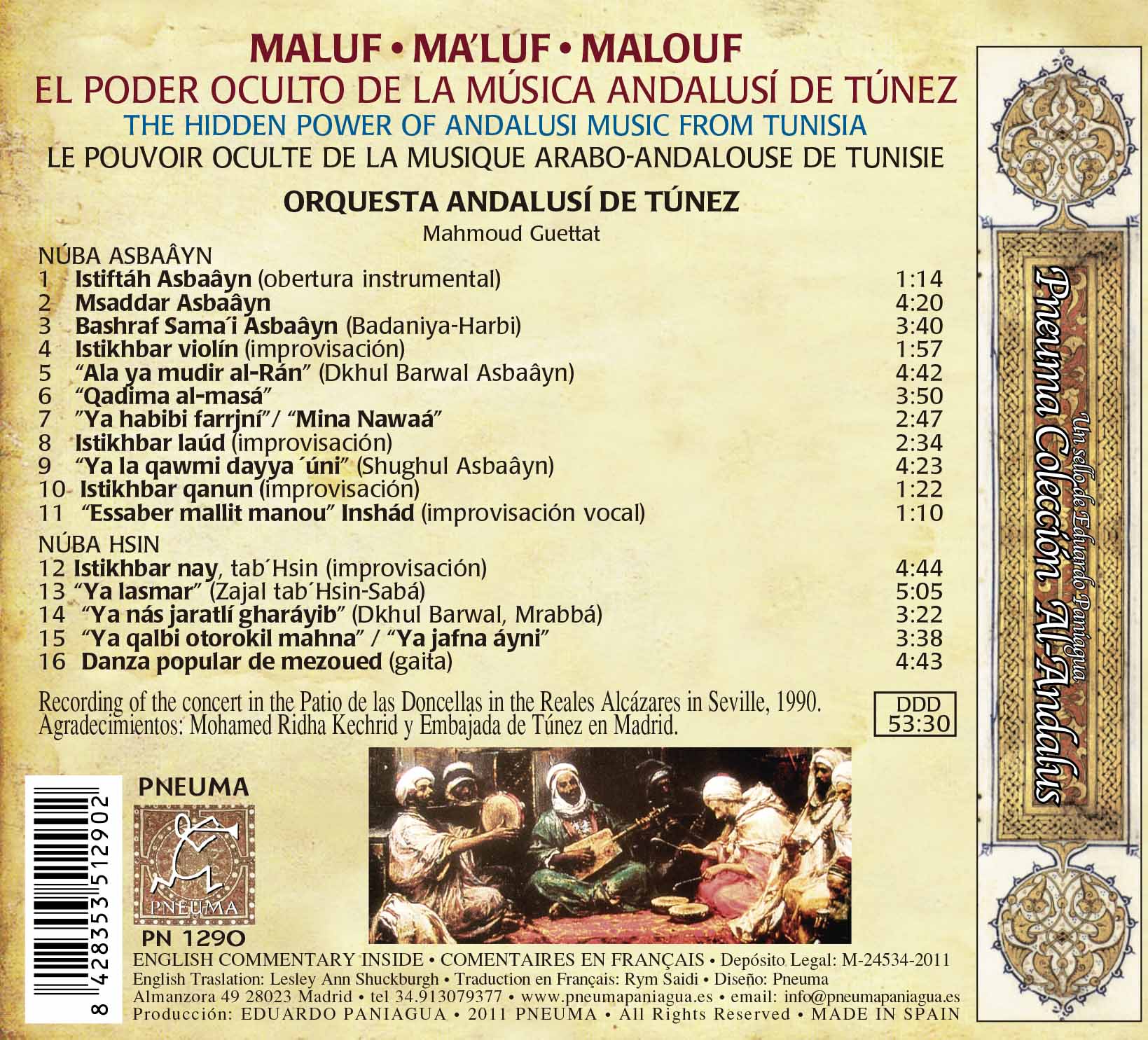 El presente CD del sello Pneuma en su Colección Al-Andalus, quiere contribuir a su reconocimiento y divulgación. Nos unimos a los que están entregados a la labor de rescatar este patrimonio musical de la humanidad, ya que existe el peligro de ver como se mezcla o fusiona con otras músicas globalizadas, en una práctica deformadora de la refinada tradición heredada. También queremos reivindicar el origen español de esta cultura islámica en lengua árabe, que emigró a Túnez. Con el sonido propio de una grabación en concierto, se muestra una variedad de obras instrumentales y vocales en una interpretación tradicional, abriendo al curioso la puerta de esta musica que une Al-Andalus- España y Túnez.
