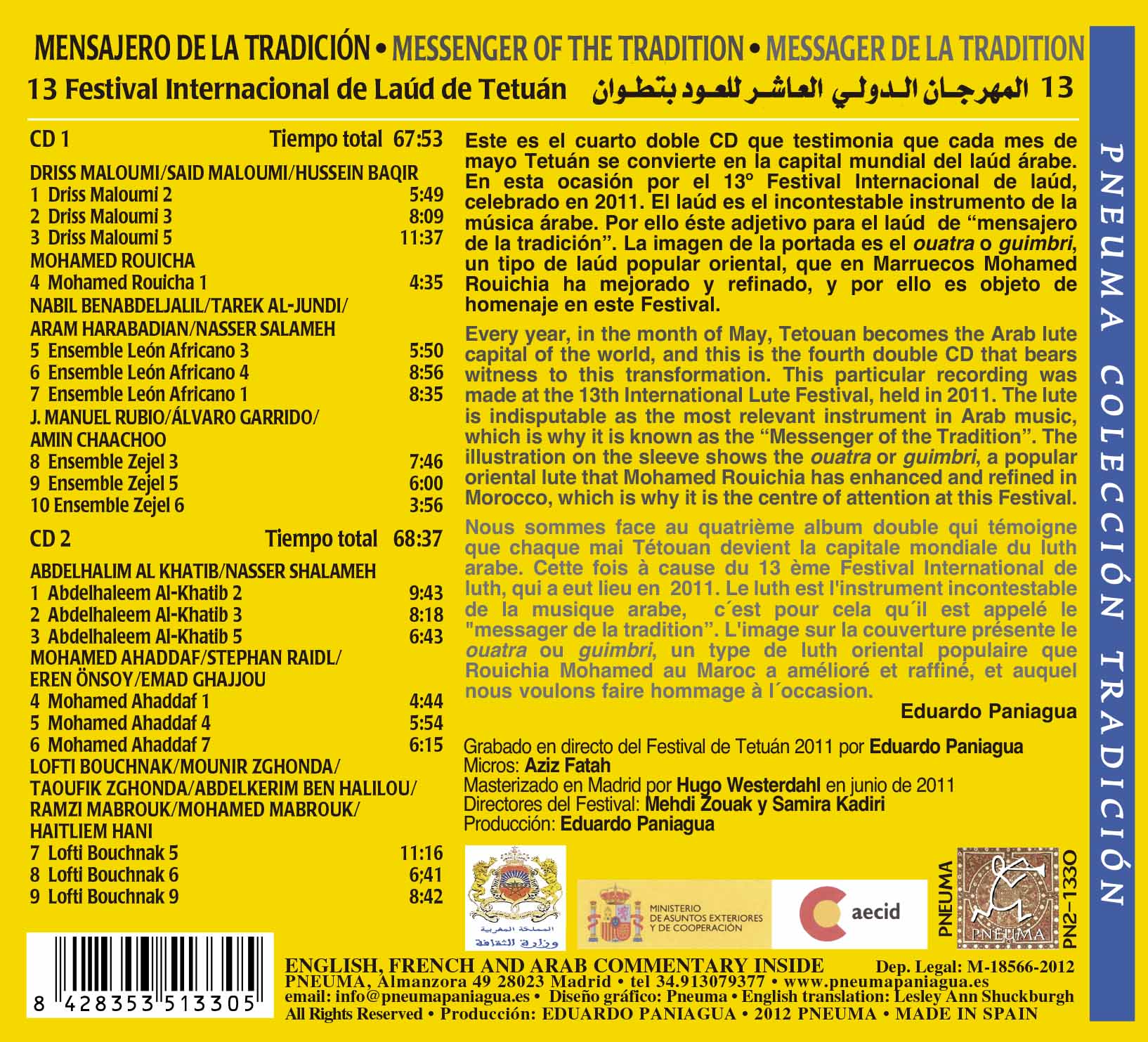 Este es el cuarto doble CD que testimonia que cada mes de mayo Tetuán se convierte en la capital mundial del laúd árabe. En esta ocasión por el 13º Festival Internacional de laúd, celebrado en 2011. El laúd es el incontestable instrumento de la música árabe. Por ello éste adjetivo para el laúd de “mensajero de la tradición”. La imagen de la portada es el ouatra o guimbri, un tipo de laúd popular oriental, que en Marruecos Mohamed Rouichia ha mejorado y refinado, y por ello es objeto de homenaje en este Festival.