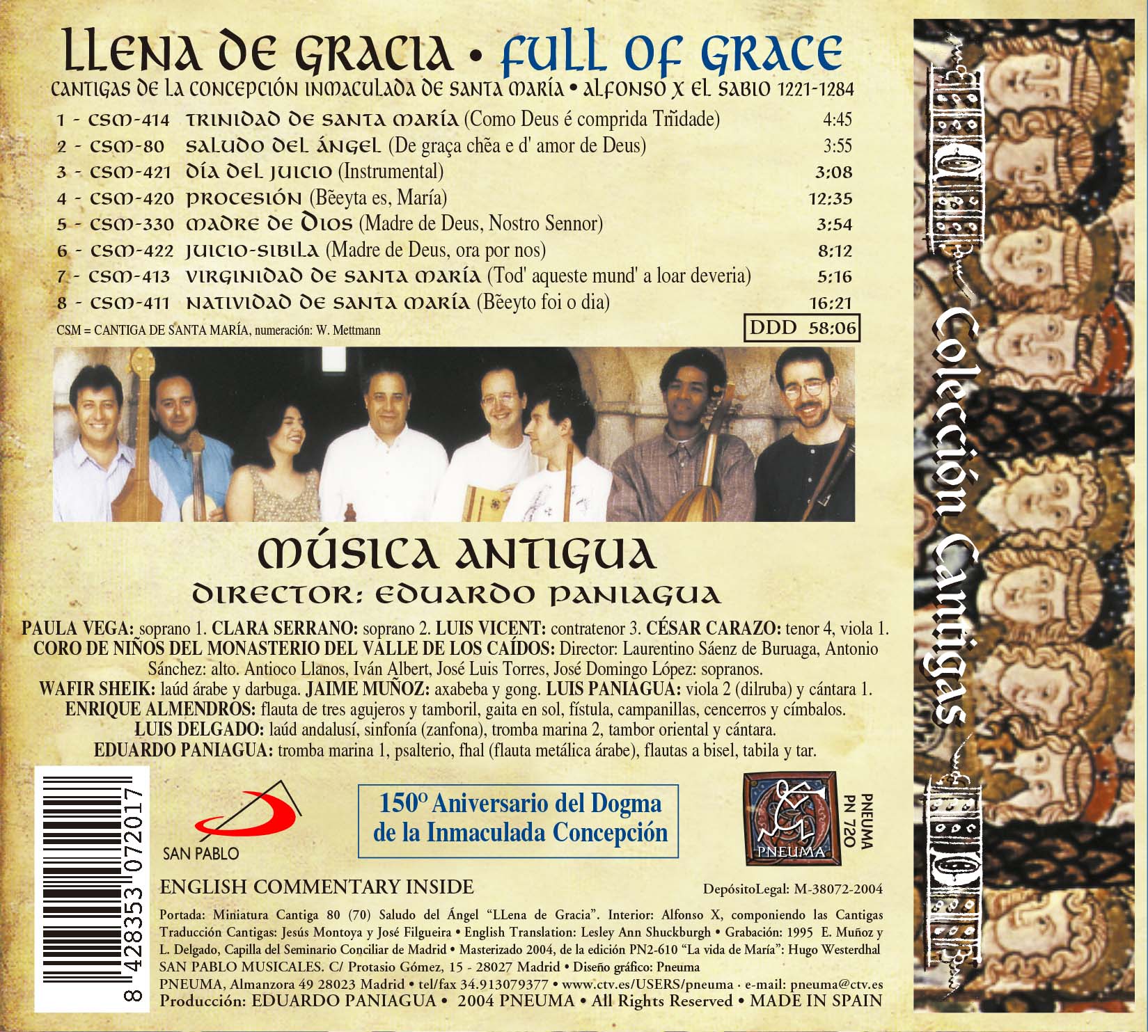“Llena de gracia” es una recopilación de las Cantigas de Alfonso X el Sabio, que contienen alusiones a la inmaculada concepción de Santa María. Este CD se presenta con motivo del 150º aniversario de la proclamación del Dogma de la Inmaculada Concepción por Pío IX el 8 de diciembre de 1854 con la “Bula Ineffabilis Deus”.